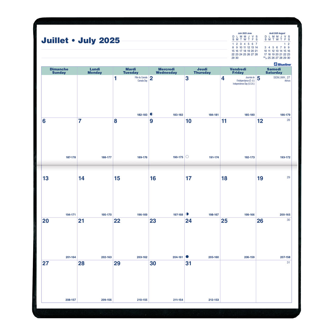 The VERSATILE Blueline® Essential Monthly Pocket Planner spans 18 months of planning, from July 2025 to December 2026, with one month per two-page spread and one block per day. RESOURCEFUL attention to detail with the inclusion of: reference calendar of previous and following month on each spread, weeks beginning on Sunday, countdown of days passed, days to come (Julian dates), phases of the moon, holidays, and dedicated notes area in each month. DURABLE stitched binding holds a soft Castillan jacket in assorted colours. PRACTICAL and convenient pocket size, 6.5" x 3.5". Assorted colours: Black, Navy, Burgundy and Green, chosen at random. Bilingual in English and French.