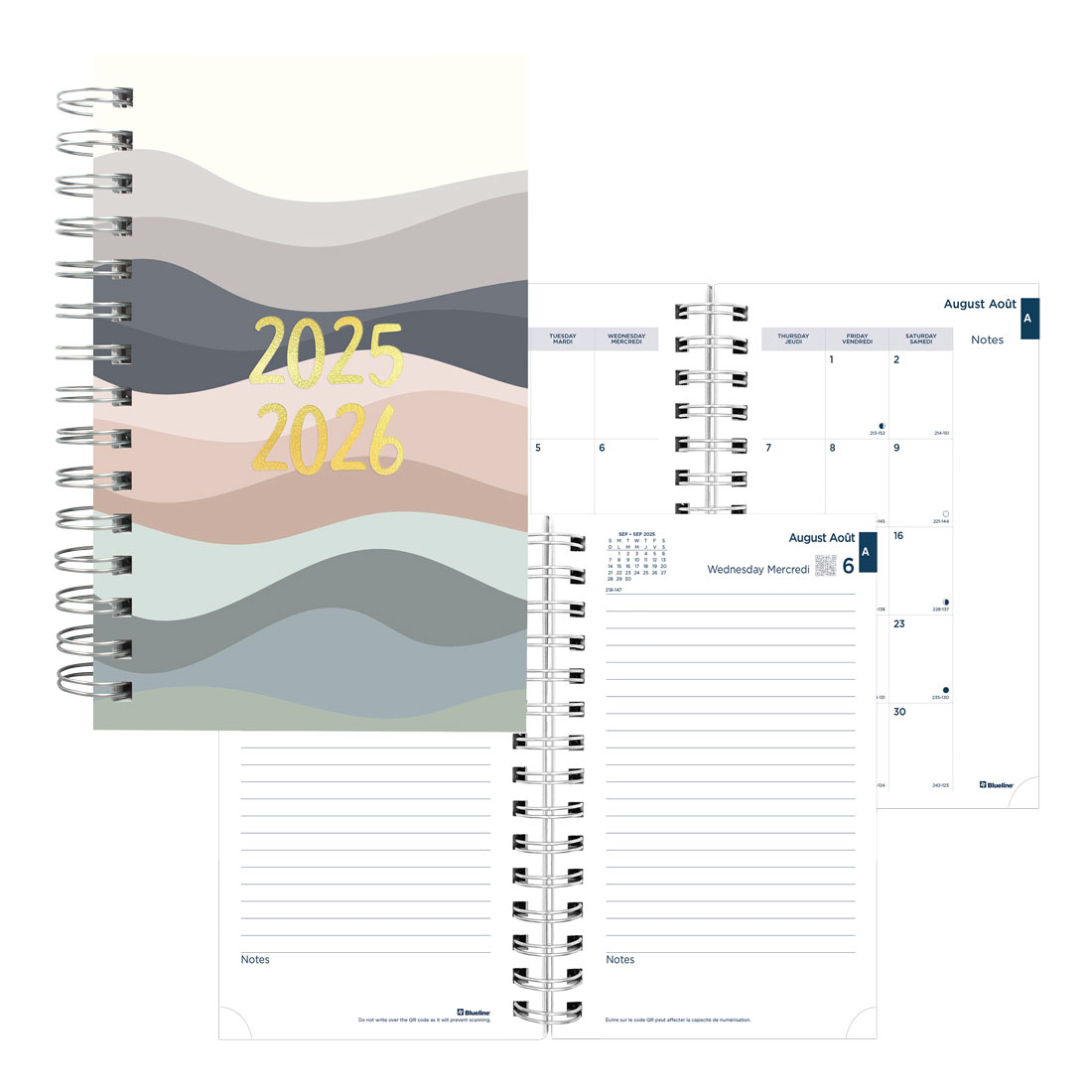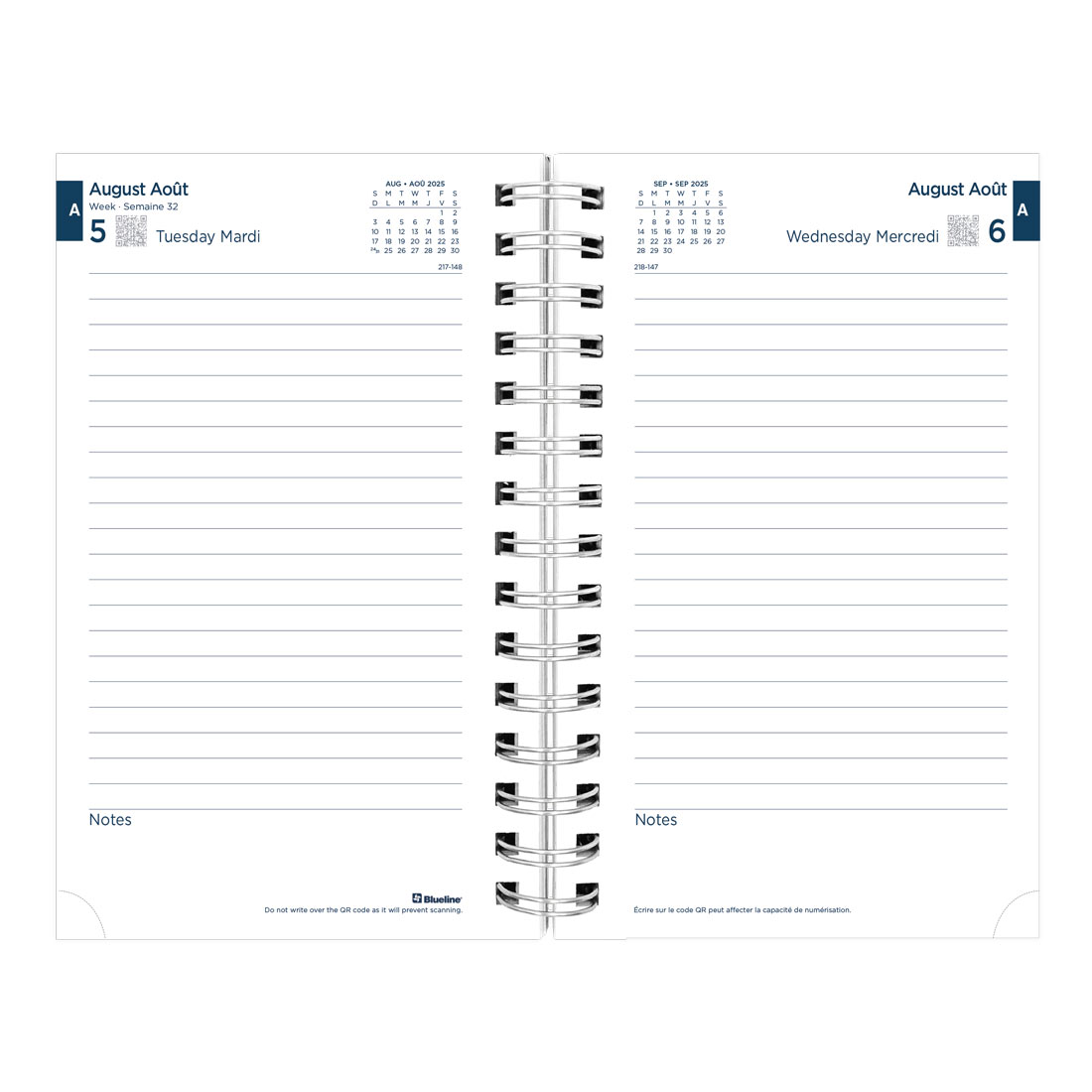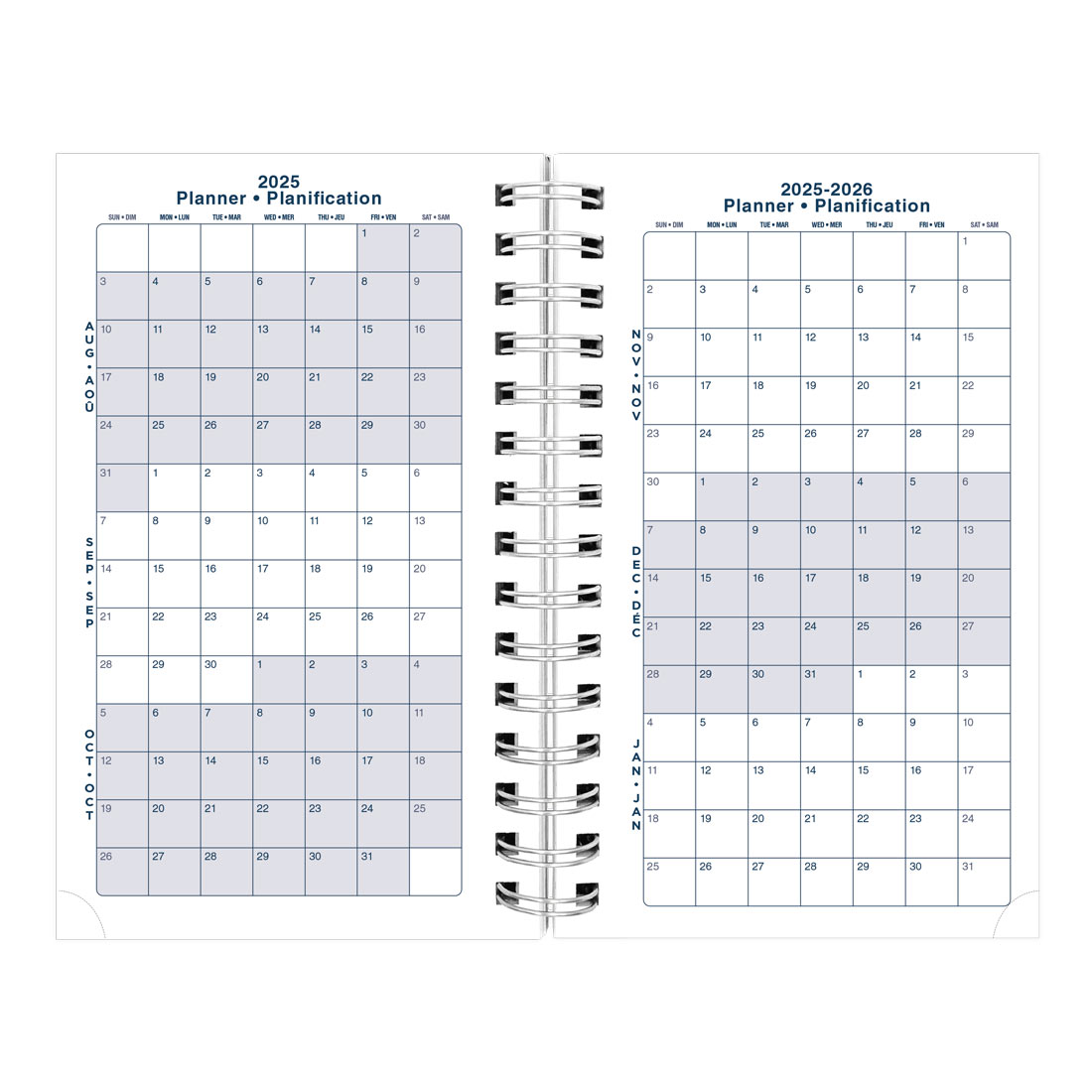 The VERSATILE Blueline® Essential Academic Daily/Monthly Planner, 12 months, August 2025 to July 2026, with one day per page spread and monthly planner at the beginning of each month. Updated with untimed format for open scheduling. Practical attention to detail with the inclusion of: reference calendar of current and following month on each spread, numbered weeks, countdown of days passed, days to come (Julian dates), phases of the moon, holidays, dedicated notes area in each day, and tear-off corners. FLEXIBLE twin-wire binding with a durable, poly fashion cover allows planner to fold back for a flat and sturdy writing surface. Logo and date stamping on the cover. Maximize these CONVENIENT, updated features: quarterly planner, class schedule, project planner, monthly goals, event calendar, contacts (telephone/address section), passwords, to do lists, note pages, and three-year overview. Four-color stickers for visual reminders. Bilingual in English and French, size: 8" x 5".