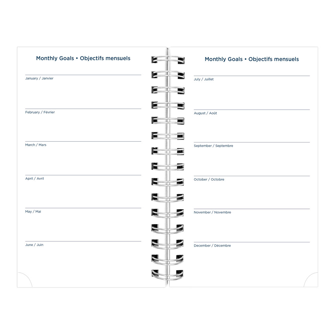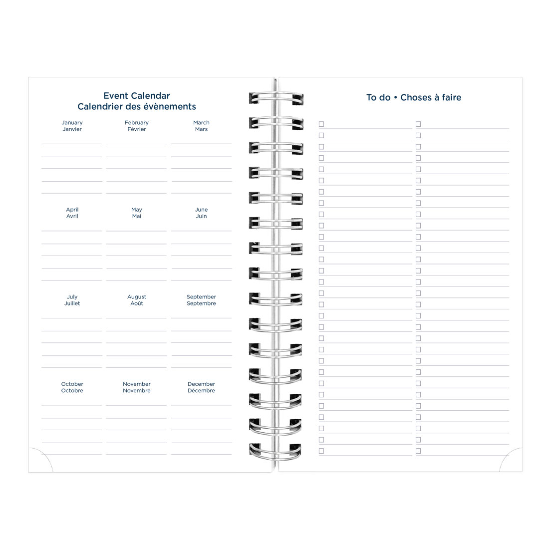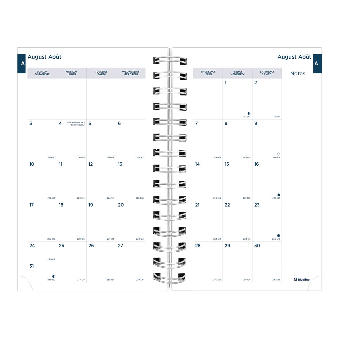 The VERSATILE Blueline® Essential Academic Daily/Monthly Planner, 12 months, August 2025 to July 2026, with one day per page spread and monthly planner at the beginning of each month. Updated with untimed format for open scheduling. Practical attention to detail with the inclusion of: reference calendar of current and following month on each spread, numbered weeks, countdown of days passed, days to come (Julian dates), phases of the moon, holidays, dedicated notes area in each day, and tear-off corners. FLEXIBLE twin-wire binding with a durable, poly fashion cover allows planner to fold back for a flat and sturdy writing surface. Logo and date stamping on the cover. Maximize these CONVENIENT, updated features: quarterly planner, class schedule, project planner, monthly goals, event calendar, contacts (telephone/address section), passwords, to do lists, note pages, and three-year overview. Four-color stickers for visual reminders. Bilingual in English and French, size: 8" x 5".