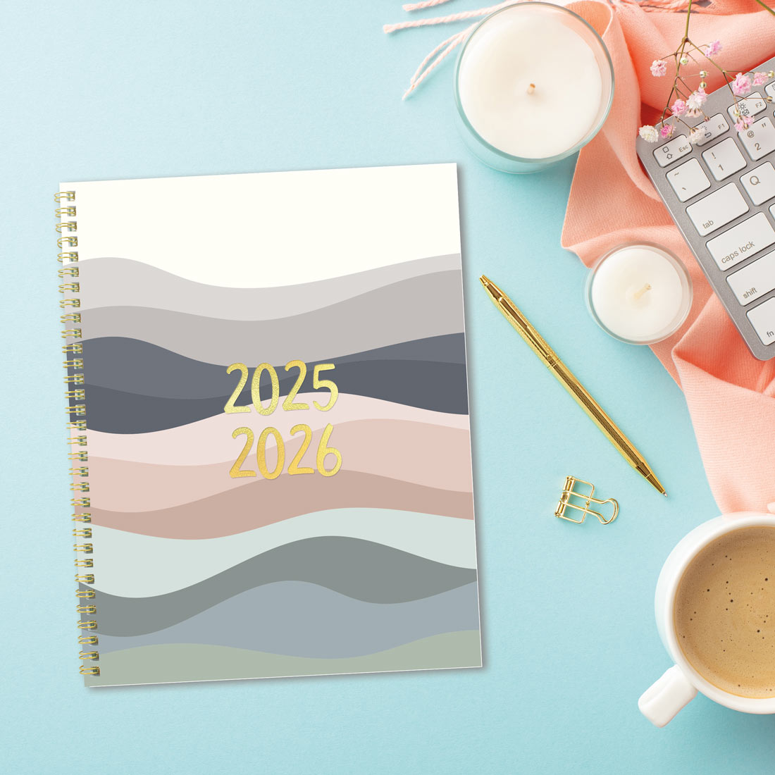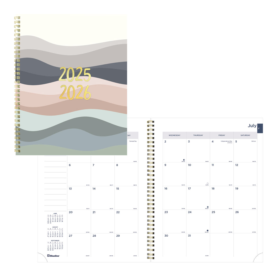 The VERSATILE Blueline® Essential Academic Monthly Planner provides 14 months of planning from July 2025 to August 2026, with one month per two-page layout and one unruled block per day and pays PRACTICAL attention to detail with the inclusion of: reference calendar of previous and following two months on each spread, numbered weeks beginning on Sunday, countdown of days passed, days to come (Julian dates), phases of the moon, holidays, dedicated notes area in each month, and tear-off corners. FLEXIBLE gold twin-wire binding with a durable, poly fashion cover allows planner to fold back for a flat and sturdy writing surface. Logo and date stamping on the cover. Maximize these CONVENIENT, updated features: quarterly planner, class schedule, project planner, contacts (telephone/address section), passwords, to do lists, note pages, and three-year overview. Four-color stickers for visual reminders. English language, size: 11" x 8.5".