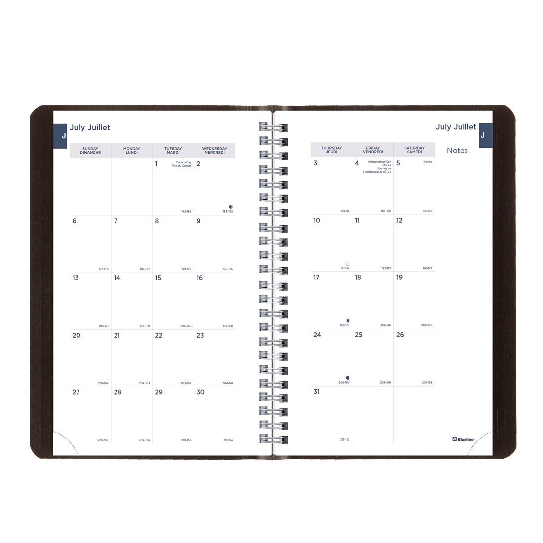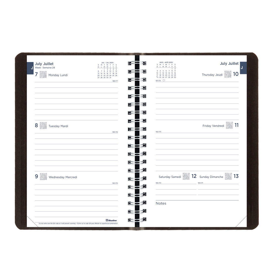The VERSATILE Blueline® Essential Academic Weekly/Monthly Planner provides 13 months of planning from July 2025 to July 2026, with week on two-page layout and monthly planner before each month, and pays practical attention to detail with the inclusion of: reference calendar of current month in each week, numbered weeks, countdown of days passed, days to come (Julian dates), phases of the moon, holidays, dedicated notes area in each week, and tear-off corners. Weeks begin on Monday with ruled space for each day. FLEXIBLE twin-wire binding with durable soft Vicuana cover allows planner to fold back for a flat and sturdy writing surface. Logo and date stamping on the cover. Maximize these CONVENIENT, updated features: quarterly planner, event calendar, contacts (telephone/address section), passwords, to do lists, note pages, and three-year overview. Four-color stickers for visual reminders. Bilingual in English and French, size: 8" x 5".