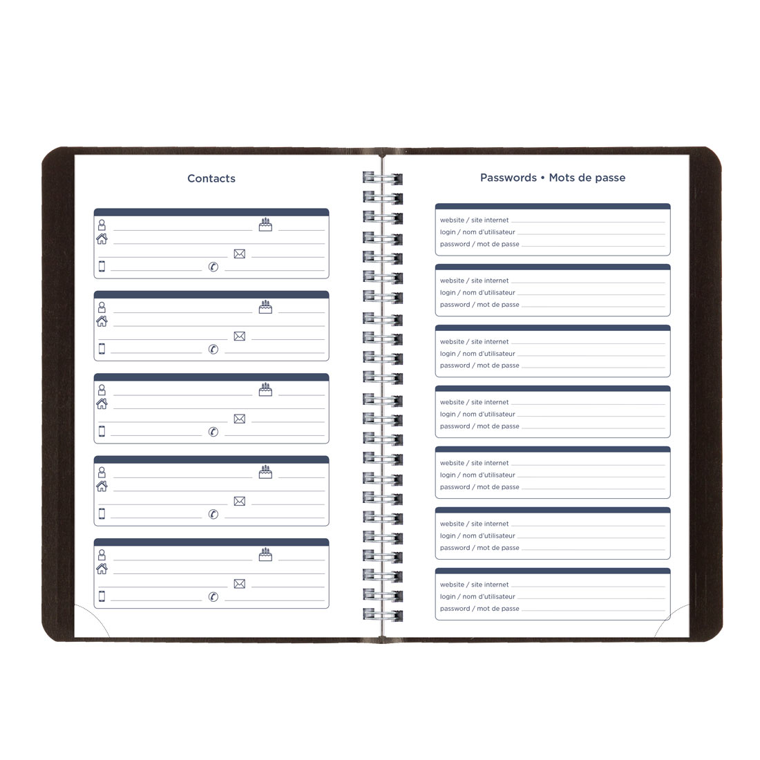 • Includes pages for: event calendar, passwords, notes and to-do lists