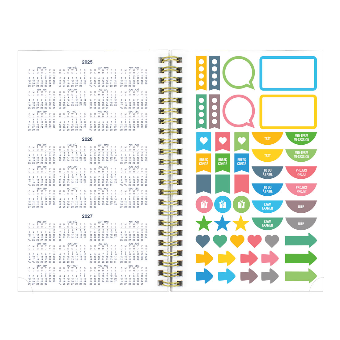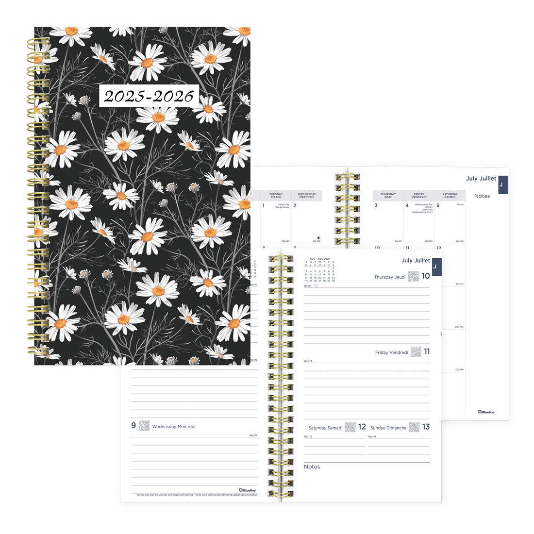 The VERSATILE Blueline® Essential Academic Weekly/Monthly Planner provides 13 months of planning from July 2025 to July 2026, with week on two-page layout and monthly planner before each month, and pays practical attention to detail with the inclusion of: reference calendar of current month in each week, numbered weeks, countdown of days passed, days to come (Julian dates), phases of the moon, holidays, dedicated notes area in each week, and tear-off corners. Weeks begin on Monday with ruled space for each day. FLEXIBLE gold twin-wire binding with a durable, poly fashion cover allows planner to fold back for a flat and sturdy writing surface. Date stamping on the cover. Maximize these CONVENIENT, updated features: quarterly planner, event calendar, contacts (telephone/address section), passwords, to do lists, note pages, and three-year overview. Four-color stickers for visual reminders. Bilingual in English and French, size: 8" x 5".